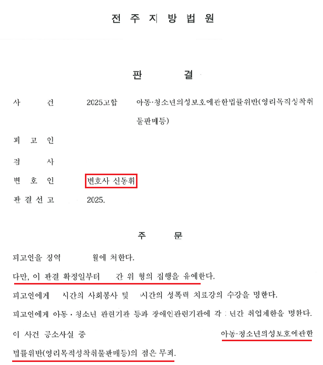 #전주변호사 #전주형사변호사 #전주성범죄변호사 #아동청소년의성보호에관한법률 #영리목적성착취물판매 #집행유예 #성범죄변호사 #일부무죄