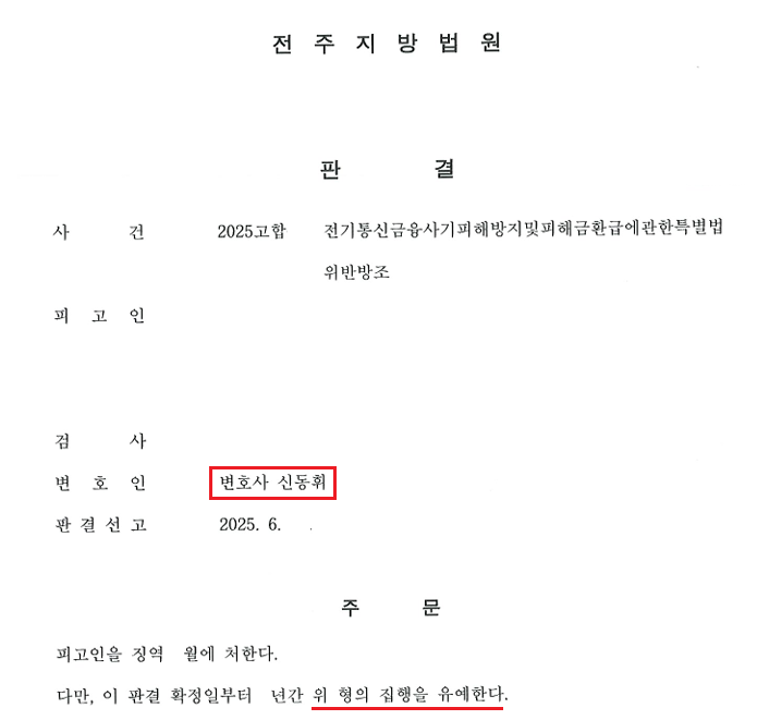 전기통신금융사기피해방지및피해금환급에관한특별법위반방조 사건에서 피고인을 변호하여 징역형의 집행유예 선고를 받은 성공 사례를 전해드립니다.
