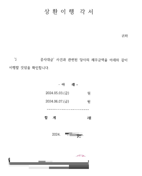 상대방 회사는 법률사무소 승문의 강제집행이 단계별로 진행되기 시작하자 결국 법률사무소 승문에 공사대금 전액과 소송비용 등을 전액상환하겠다는 의사를 밝히면서 변제각서를 작성하여주었으며, 결국 의뢰인은 공사대금 전액, 이자, 소송비용 등을 전액상환받을 수 있었습니다.