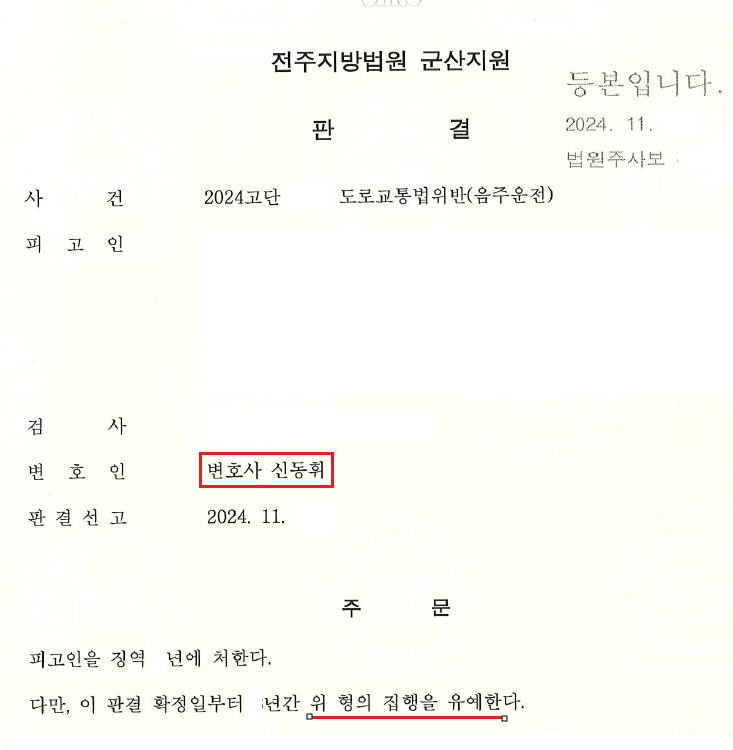도로교통법위반(음주운전) 사건 진행경과 집행유예 받은 소식을 전해드립니다. * 담당변호사 : 신동휘 변호사