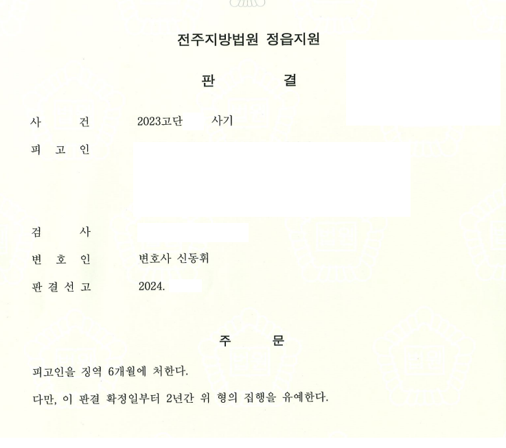 사기사건 진행경과 집행유예 받은 소식을 전해드립니다. * 담당변호사 : 신동휘 변호사