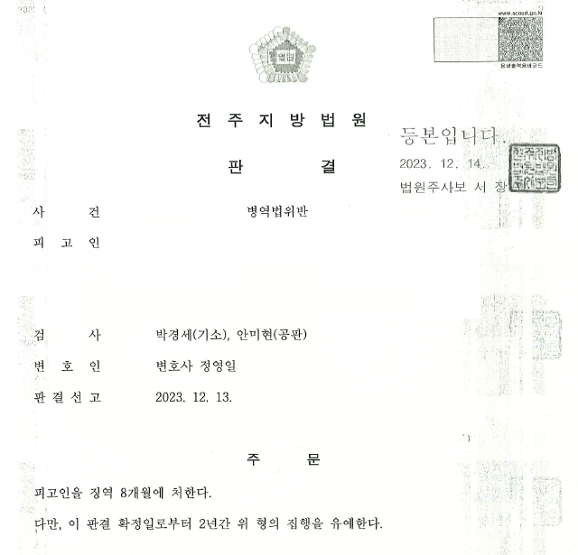 병역법위반 사건 진행경과 집행유예 받은 소식을 전달해 드립니다.