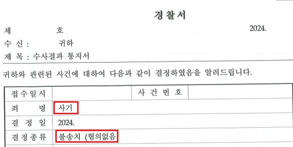 사기사건 진행경과 불송치(혐의없음)된 소식을 전해드립니다. * 담당변호사 : 신동휘 변호사