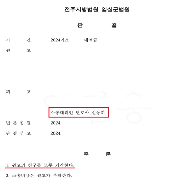 위와 같은 조력 결과, 법원은 상대방인 C의 청구를 기각하여 의뢰인 A는 전부 승소 판결을 얻을 수 있게 되었습니다.