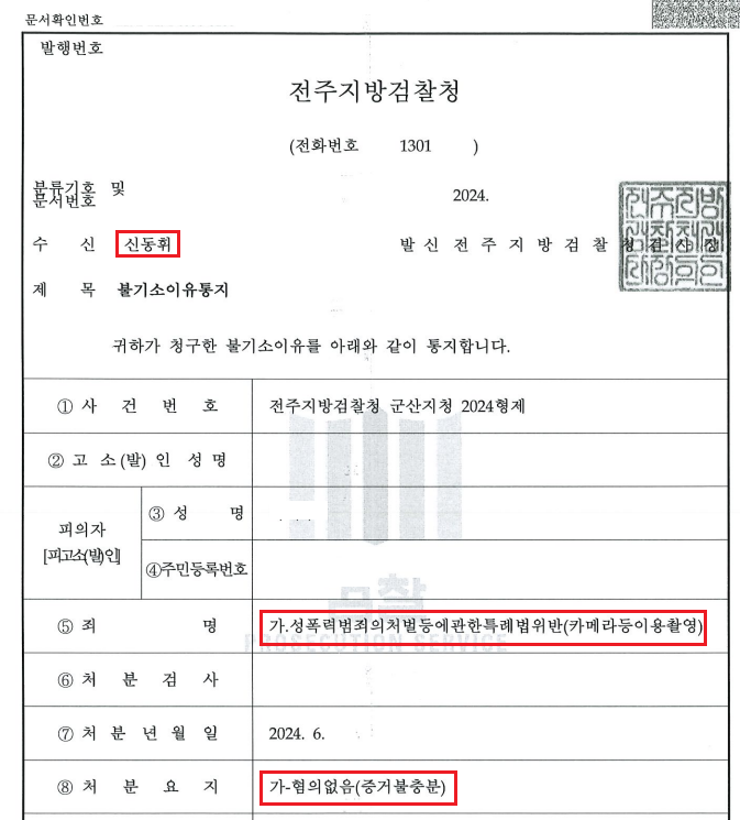 성폭력범죄의처벌등에관한특례법위반(카메라등이용촬영) 사건 진행경과 혐의없음 받은 소식을 전해드립니다. * 담당변호사 : 신동휘 변호사