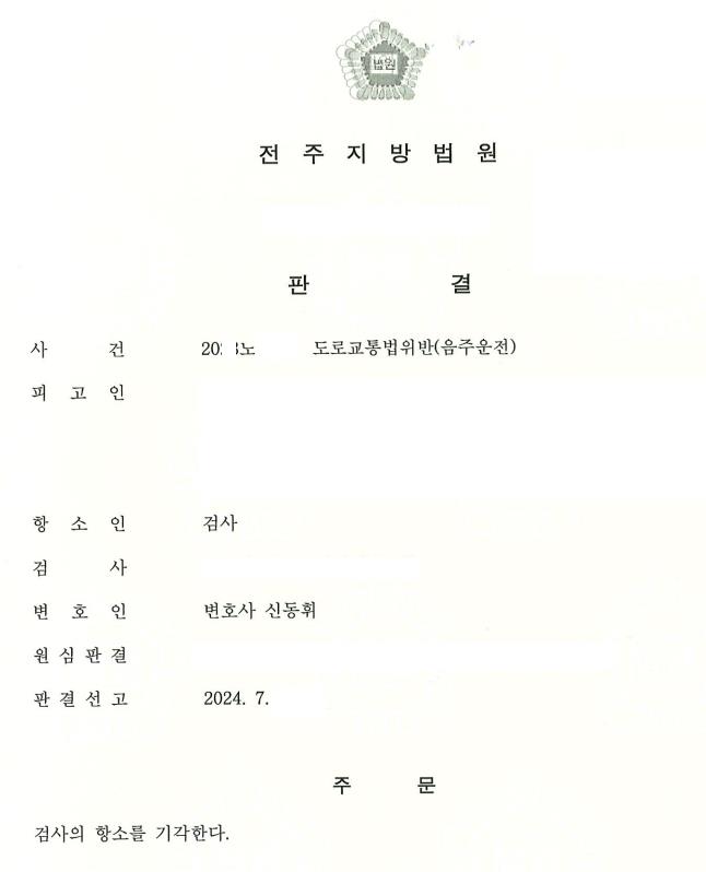 도로교통법위반(음주운전) 사건 진행경과 검사 항소 기각된 소식을 전해드립니다. * 담당변호사 : 신동휘 변호사