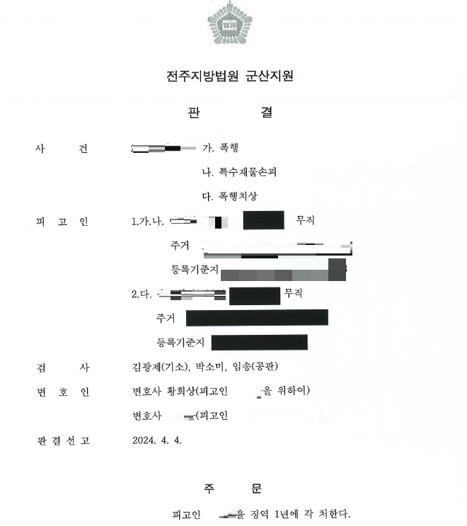 폭행치상 사건 진행경과 상대방측 징역1년 실형 선고 받은 소식을 전해드립니다.