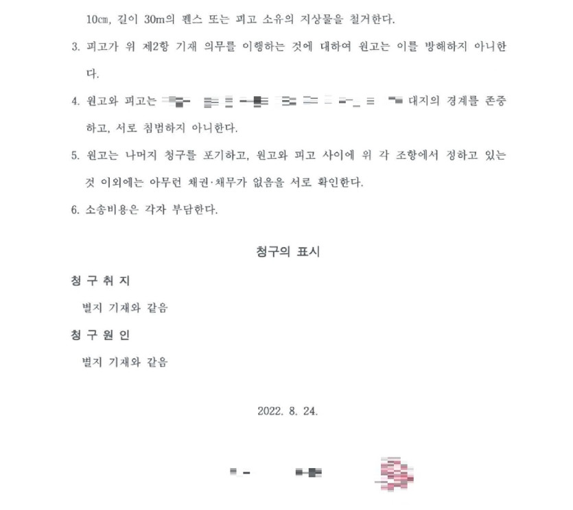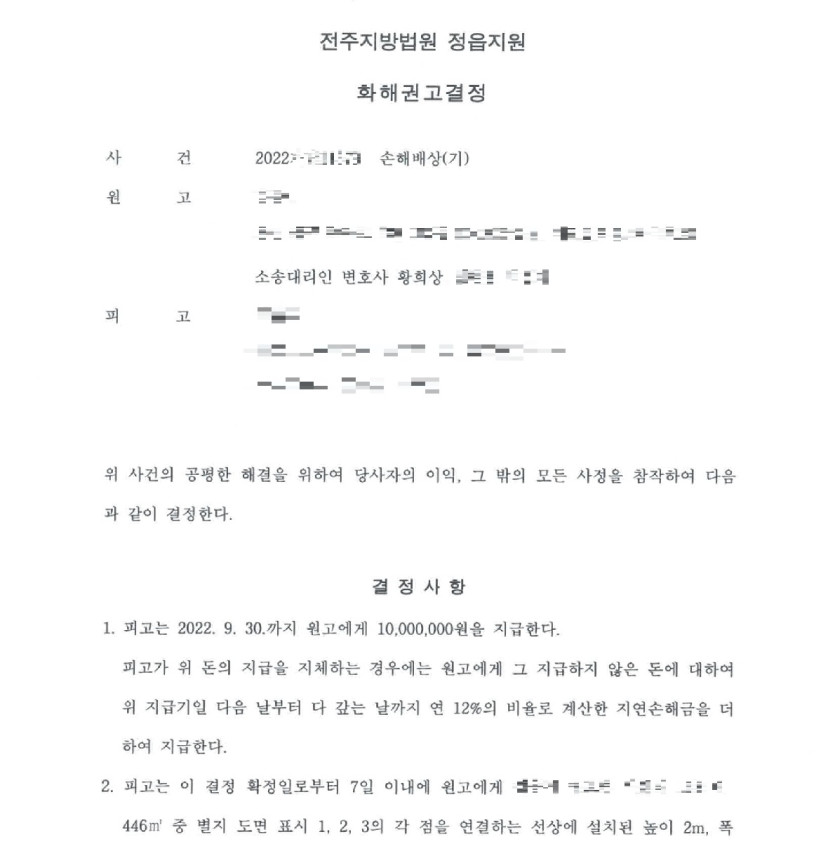 법률사무소 승문은 상대방이 의뢰인에게 일정 금액의 손해배상금을 지급하도록 하고, 상대방이 의뢰인 소유의 토지에 설치한 일부 구조물들을 철거하도록 하며, 향후 상대방은 의뢰인 소유 토지의 경계를 침범하지 못하도록 하는 결정을 얻어내었습니다.