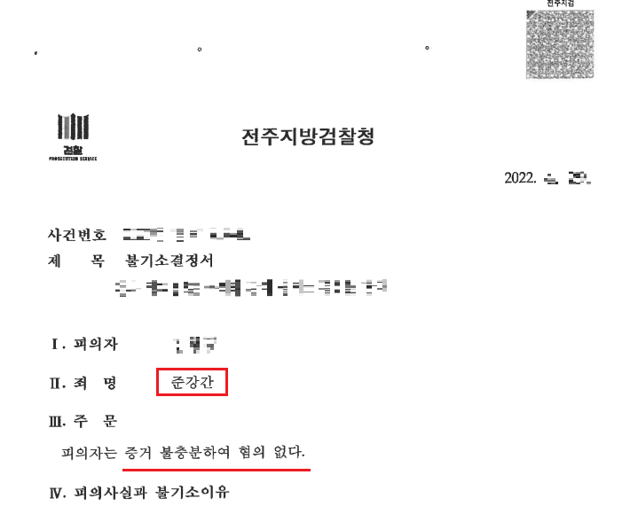 본 변호인의 조력 결과, 검사는 피해자의 진술만으로는 의뢰인에 대한 범죄혐의 입증이 어렵다고 보아, 의뢰인에게 혐의없음 처분을 하였습니다.