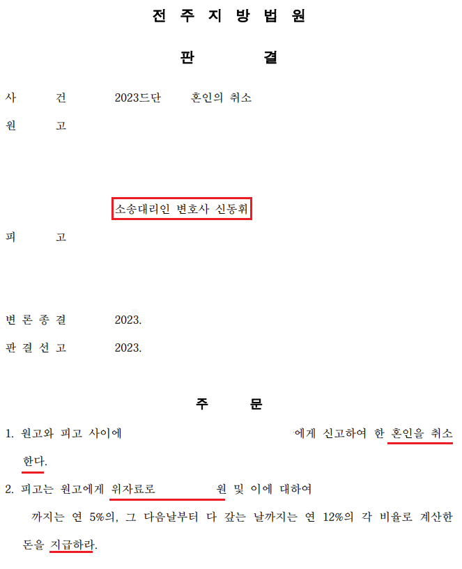혼인 취소 및 위자료 사건 진행경과 전부 승소 소식을 소개해 드리려 합니다. * 담당변호사 : 신동휘 변호사