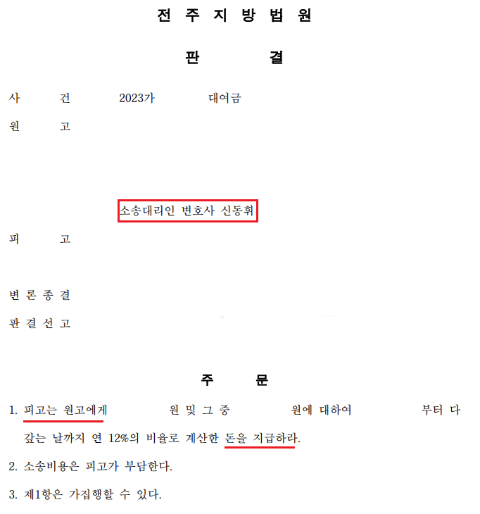 위와 같은 조력의 결과, 법원은 의뢰인이 상대방에게 돈을 대여해 주었다는 사실을 인정하였고, 의뢰인은 전부 승소 판결을 얻을 수 있었습니다.