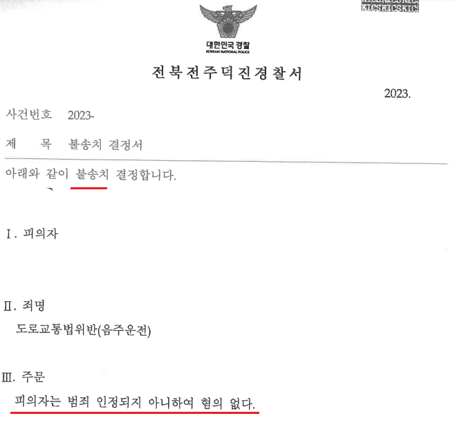 [] 도로교통법위반(음주운전) / 불송치(혐의없음)