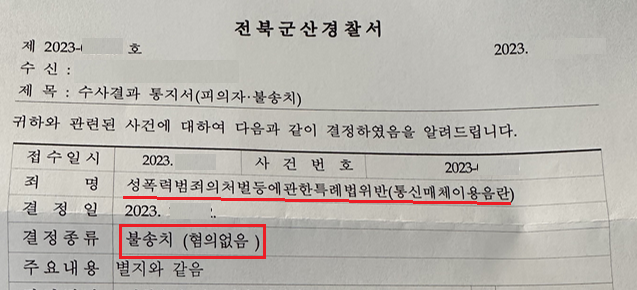 [] 성폭력범죄의처벌등에관한특례법위반(통신매체이용음란) / 불송치(혐의없음)