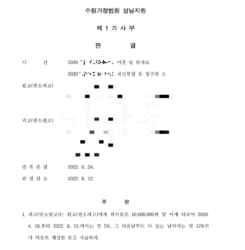 재판부는 법률사무소 승문이 제출한 주장·증거들을 검토하였고, 법률사무소 승문의 주장대로 의뢰인이 사업을 주도적으로 수행하였다는 사실을 인정하면서 의뢰인의 공동재산형성기여도가 더 높다고 판단하였고, 아내가 의뢰인에게 일정 금액의 금원을 지급하라고 판결내리게 되었습니다.