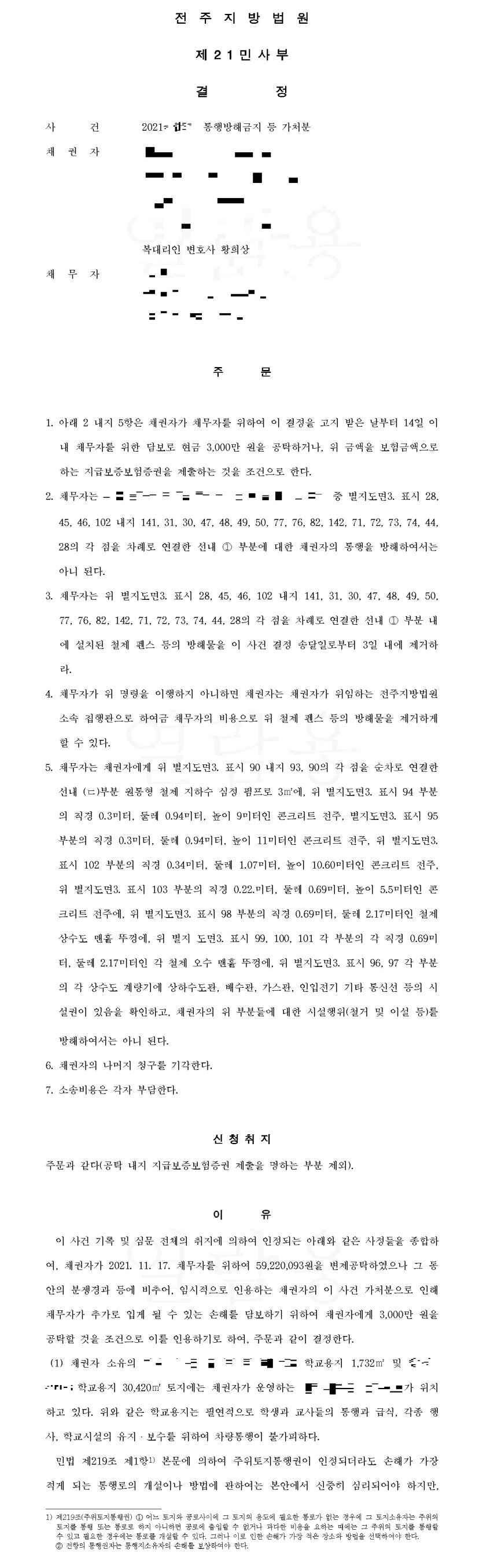 [] 주위토지통행권확인, 통행방해금지, 수도등시설권확인 가처분 / 승소