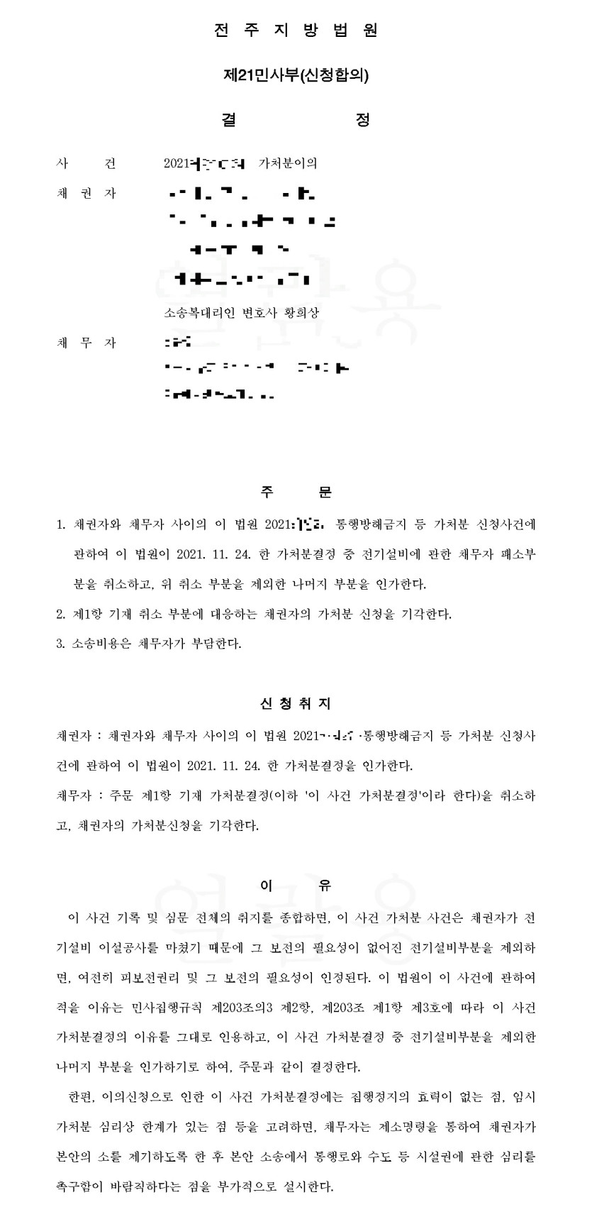 재판부는 법률사무소 승문이 제출한 주장·증거들을 면밀히 검토하였고, 법률사무소 승문이 주장한대로 의뢰인이 상대방의 토지를 사용하는 것에 필요성이 있으며, 상대방이 현재 철제 구조물 등을 설치하여 의뢰인의 통행을 방해하는 것은 위법하다고 판시하였고, 의뢰인은 다시 상대방의 토지를 이용하여 통행할 수 있게 되었습니다. 나아가 상대방은 재판부에 결정에 불복하여 이의를 신청하였으나 합의부 재판부 역시 의뢰인의 주위토지통행권, 수도등시설권을 다시 한 번 인정하고 확인하여주었습니다.