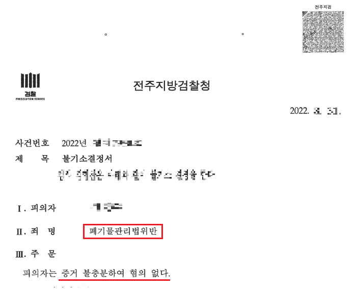 폐기물관리법위반 사건 진행경과 혐의없음 받은 소식을 소개해 드리려 합니다. * 담당변호사 : 신동휘 변호사