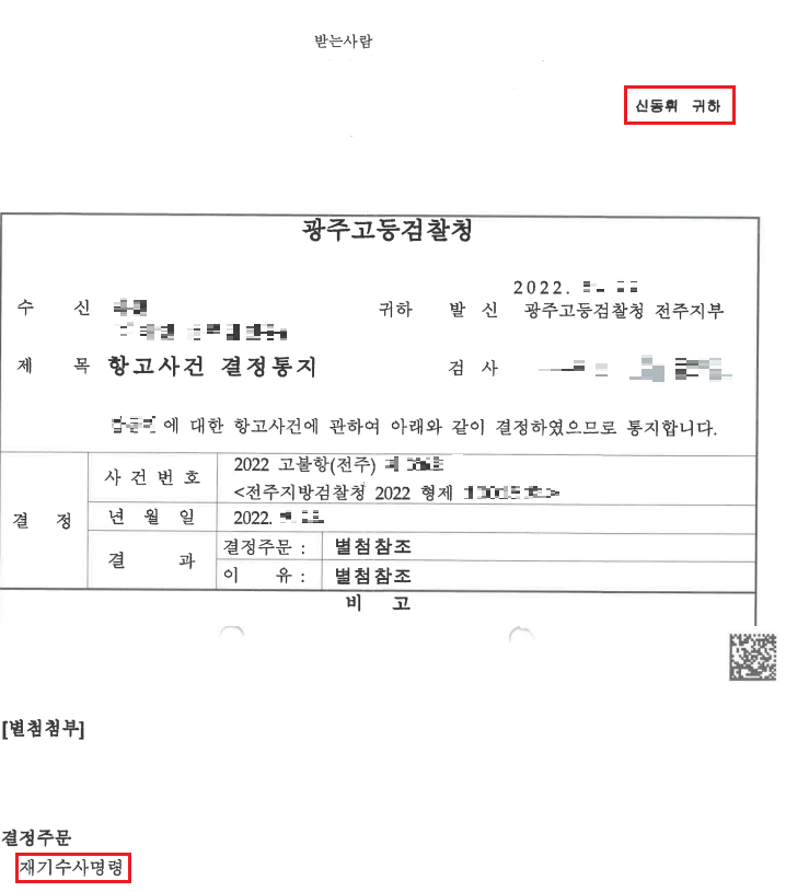 위와 같은 조력 결과 광주고등검찰청은 전주지방검찰청 검사에게 재기수사를 명하였습니다.