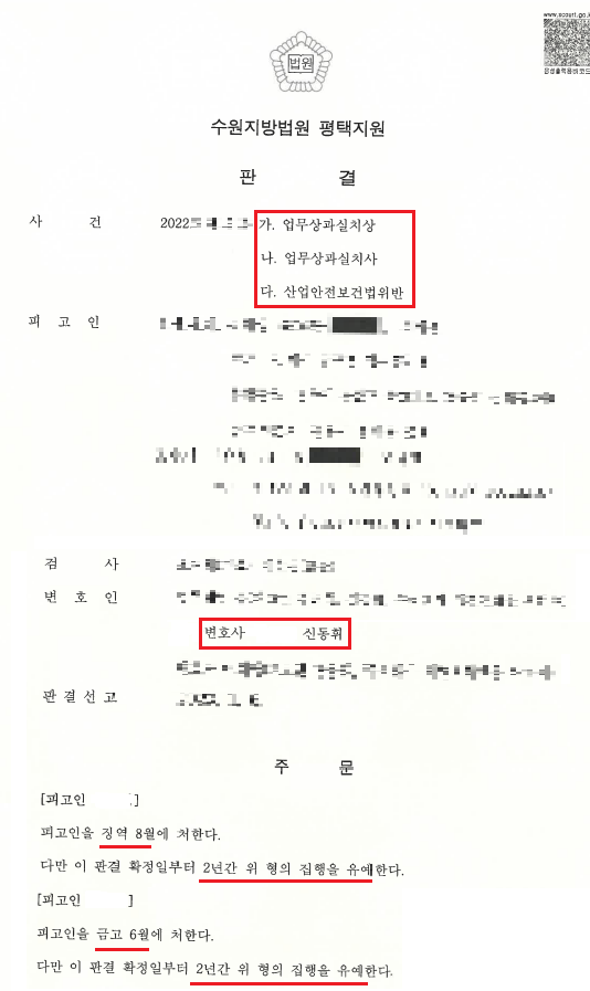 업무상과실치상등 사건 진행경과 집행유예 받은 소식을 소개해 드리려 합니다. * 담당변호사 : 신동휘 변호사