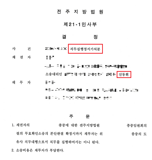 종중회장 직무대행자 직무집행정지가처분 사건 진행경과 인용 결정 받은 소식을 소개해 드리려 합니다. * 담당변호사 : 신동휘 변호사