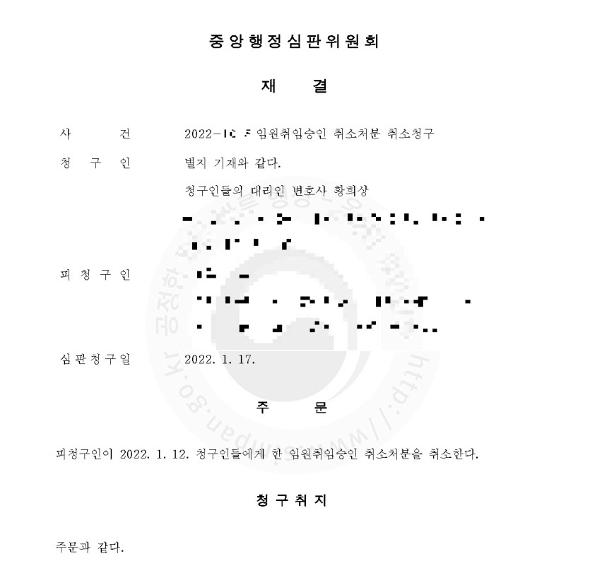중앙행정심판위원회는 법률사무소 승문이 제출한 주장·증거들을 자세하게 검토하였고, 결국 법률사무소 승문의 주장대로 문제의 원인이 의뢰인들에게만 있는 것이 아니라 인근 토지 소유자에게도 있다는 점, 의뢰인들이 문제를 해결하기 위하여 노력하였다는 점 등을 설시하며 교육감의 임원취임승인취소처분이 부당한 처분이라고 결정 내렸습니다. 이에 의뢰인들은 다시 해당 사립학교의 이사 직위를 유지할 수 있게 되었습니다.