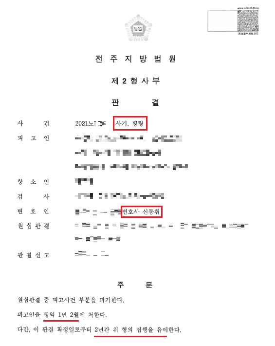 사기 등 사건 진행경과 집행유예 받은 소식을 소개해 드리려 합니다. * 담당변호사 : 신동휘 변호사