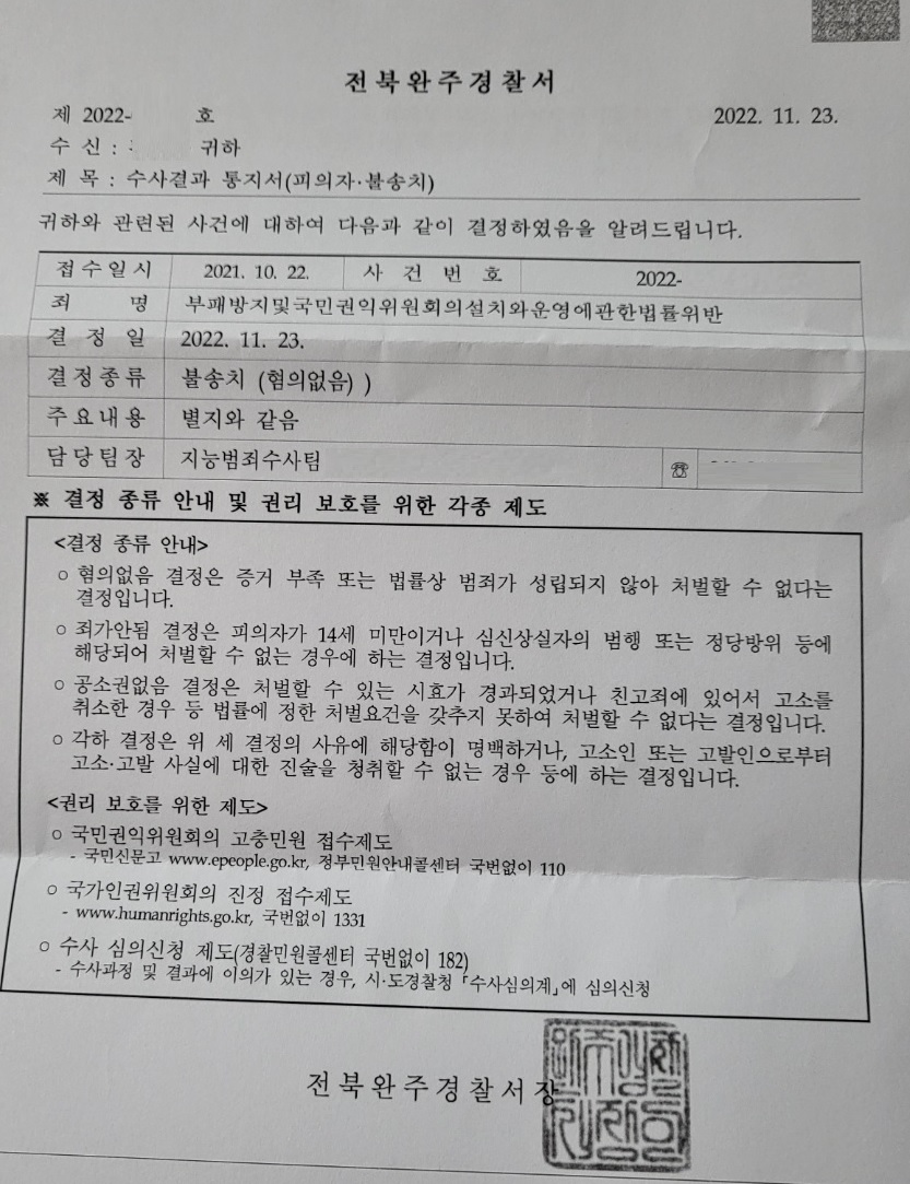 부패방지및국민권익위원회의설치와운영에관한법률(신고자등의비밀보장의무)위반 사건 진행경과 무혐의 받은 소식을 소개해 드리려 합니다.