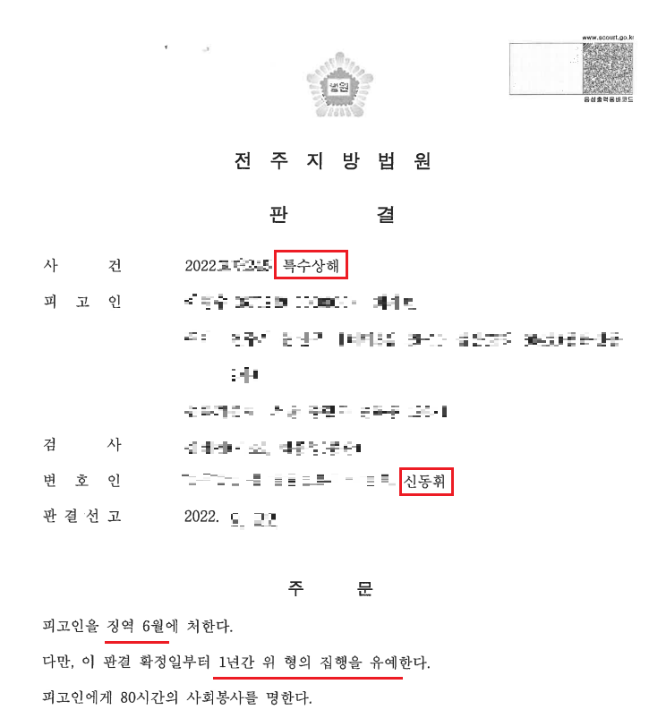 특수상해 사건 진행경과 집행유예 받은 소식을 소개해 드리려 합니다. * 담당변호사 : 신동휘 변호사
