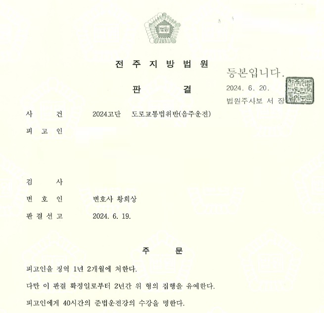 음주운전 사건 진행 결과 집행유예 받은 소식을 전해드립니다.