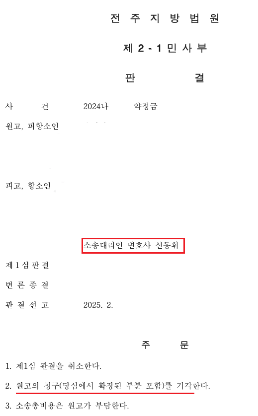 약정금 청구(피고) 진행 결과 전부 승소한 소식을 전해드립니다.     * 담당변호사 : 신동휘 변호사