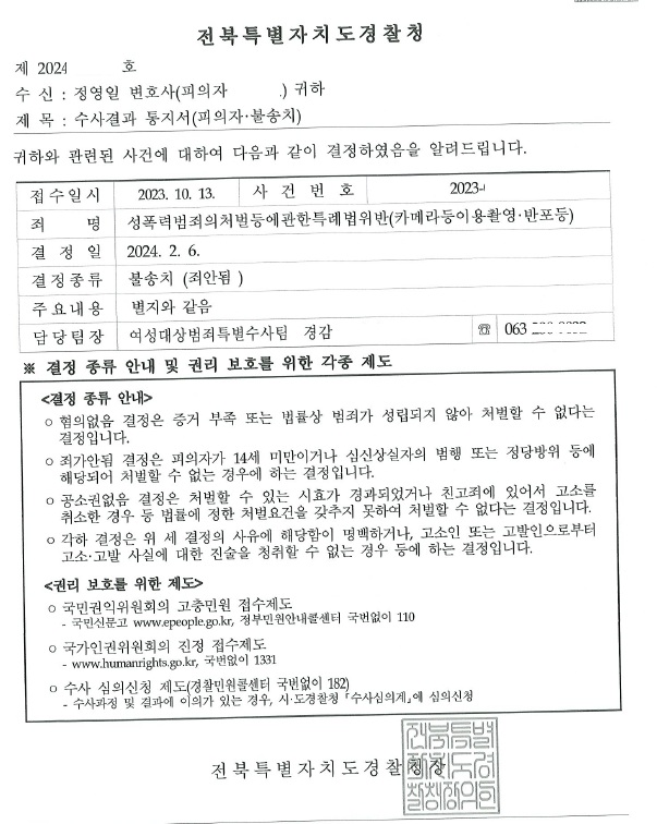 성폭력범죄의처벌등에관한특례법위반 사건진행결과 불송치(죄가안됨)받은 소식을 전해드립니다.